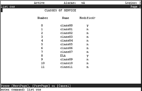 Table: Field Definitions: Classes of Service screen Field Name Valid Input Description/Procedure Number Display only This field shows the number for this Class of Service. Name Display only This field shows name for this Class of Service. Modified? Display only This field shows an n until you modify any fields on the screen. Once you save any changes, this field changes to a y.