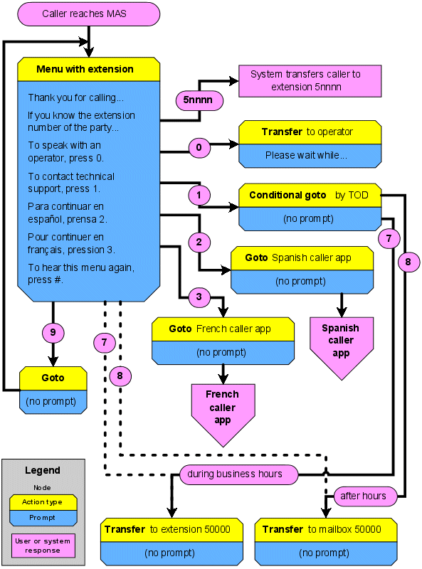 - The yellow areas (boldface) indicate what type of action is assigned to the node. The blue areas indicate what the prompt is to say (if anything). The pink areas indicate some action or response taken by either the caller or the MAS.