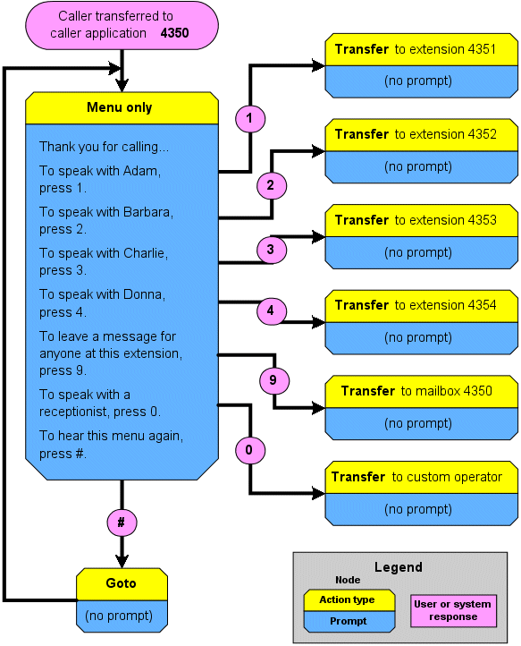 After creating and deploying this caller application, you must remember to create an association with an ID number of 4350 for this application. This caller application ID number then overrides the extension 4350 when the caller reaches the system (so that you could still use the extension number of 4350 for the group’s receptionist).