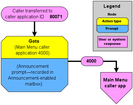 The following call flow is an example of how you can set up an announcement-enabled mailbox to be used as a daily announcement or bulletin board mailbox. When callers access this caller application by dialing xx8-0071, they hear the announcement recorded in the announcement-enabled mailbox and then are immediately transferred to the Main Menu caller application, which has an association ID of 4000.