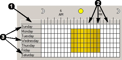 The grid has weekdays along the y-axis and the time of day along the x-axis. Cells on the grid represent a time interval, depending on the currently selected Interval, either 1 hour (default), 15 minutes or 5 minutes.