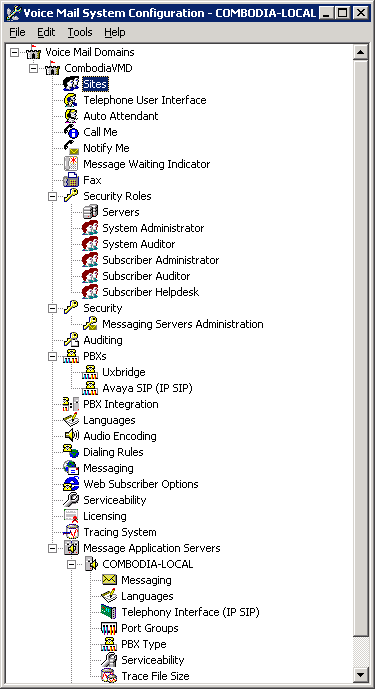 The Voice Mail System Configuration window has a tree structure so that you can access configuration screens for each voice mail domain and each MAS within the voice mail domain. Properties can be configured on three levels. At Voice Mail Domain level properties are shared across MAS groups in a voice mail domain. At Message Application Server level properties are specific to an MAS. In a MultiSite-enabled voice mail domain, the properties can also be configured for each site. See VMSC - Voice Mail Domain Nodes & MAS Nodes.