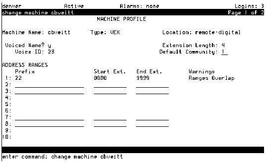 The prefix digit or digits for the range of telephone numbers for subscribers on this machine. The prefix can be used to distinguish between machines that have overlapping extensions. For example, the prefix 22 can be used to uniquely identify subscribers in one city that happen to have the same extension as subscribers on a networked machine in another city. Note that the combined length of the prefix and the extension cannot exceed 24 characters. |