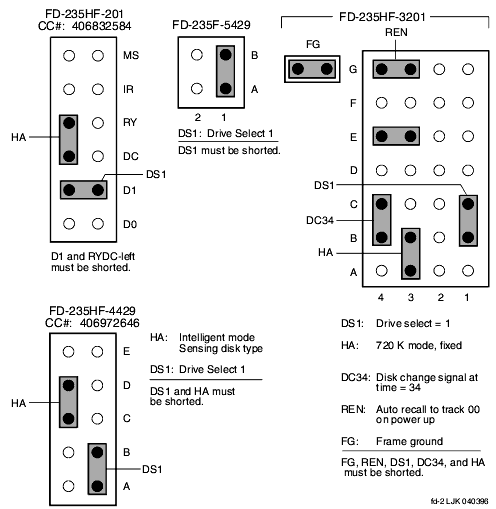 Figure: Diskette Drive Jumper Connections (201, 3201, 4429, and 5429)
