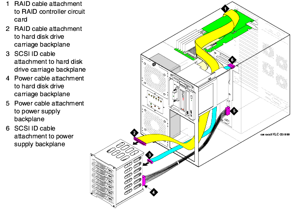 Figure: RAID Cable, SCSI ID Cable, and Hard Disk Drive Carriage Power Cable