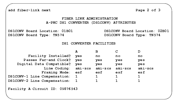 DS1CONV Board Location -- Enter the cabinet, carrier, and slot that identifies the physical location of the converter circuit pack connected to the first endpoint of the fiber link. This is entered on Page 1 and displays on Page 2.