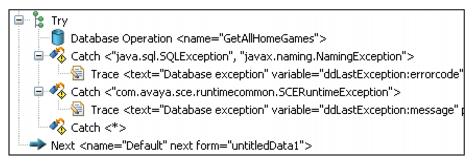 Try/Catch elements in the Data node will try to execute items under the Try item. To handle exceptions, add "Catch" items (under the parent Try).