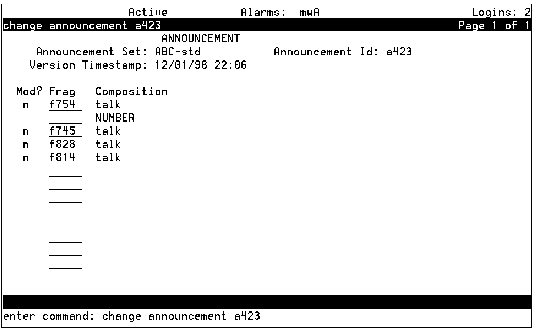 - If you used the command display, the set you entered on the command line or the administrative announcement set name specified on the System Parameters Features screen if you did not enter anything.