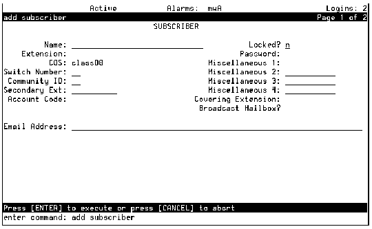 The table for Field Definitions; Subscriber Screen, Page 1 describes only the Account Code field. For additional information about the Subscriber screen and the fields it contains, see Adding a Subscriber.