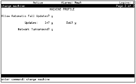 | To disable this feature system-wide, enter n on the local Machine Profile screen. To enable the feature, enter y on the local Machine Profile screen and on the appropriate remote Machine Profile screens on this local system. If enabled, a network connection that originated from this local INTUITY AUDIX system is allowed to turn around after the local INTUITY AUDIX system has sent all of its network data to any remote machine. The remote machine may then return update information, voice mail, and status on the same connection. |