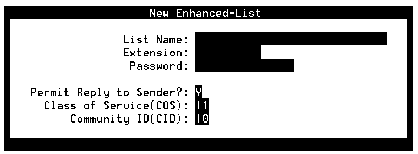 Table: Field Definitions: New Enhanced List Window Field Name Valid Input Description/Procedure List Name: 1- to 29-alphanumeric characters A name for the list. Use Guidelines for Naming Enhanced Lists. Extension: 3- to 10-numeric characters The local extension for the list mailbox. This extension must comply with your system dial plan. ELA creates a mailbox at this extension automatically, if one does not already exist.Be sure that those subscribers administered to have access to the list mailbox know this extension. Password: 5- to 15-numeric characters The password for this list mailbox.This password is for administrative purposes only. Subscribers who send messages to the ELA mailbox for distribution do not use a password. Permit Reply to Sender?: y = yes (default)