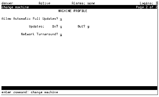 If you enter n, updates are not sent to any remote machine regardless of the entry for this field on the remote Machine Profile screen. Set this field to y only after testing the network end-to-end connectivity during initial administration.