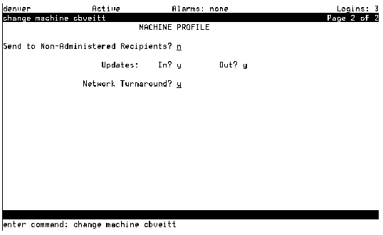 If you enter y, the system sends updates of user database information for local users to any remote machine that has its Updates: In? field set to y. If you enter n, the system does not send updates to any remote machine regardless of the entry for this field on the remote Machine Profile screen. Set this field to y only after testing the network end-to-end connectivity during initial administration. |