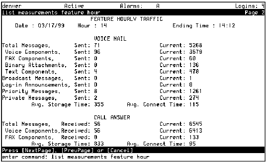 The number of call answer voice components recorded on the local machine during the reporting period. The number of call answer voice components presently stored in the local AUDIX system. |