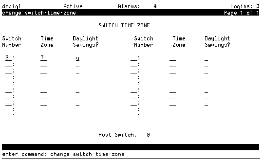 Tab to the applicable timezone field and type in a number that indicates how many time zones west of Greenwich (England) the indicated switch is located. The time zone numbers for the USA are: