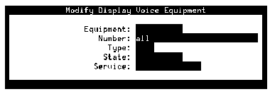 The card option displays the channels in groups of 6, corresponding to the 6 channels per IVC6 card. It also displays the card: card number, O.S. Index, function, and state. blank channel The channel option displays the channels in numeric order without division by card. group The group option displays the channels in the specified group in group order, without division by card.Number: One or more channel, card, or group numbers. You can specify: Only the cards, channels, or group specified are displayed on the Voice Equipment window. allType: SPT1TR The equipment type displays in theFunctionfield. Only the type specified displays in the Voice Equipment window. The type is displayed as part of theClassfield when Report by Card is specified and as part of the Type field when Report by Group is specified. blankState: brokenfooshwoosmanoosinserv These states are explained in the table for Field Definitions: Display Voice Equipment Window. Only the cards or channels in the state specified are displayed on the Voice Equipment window.This field is not available if the Equipment field is set togroup. blank (for all states)Service: Single service name: could be AUDIX for INTUITY AUDIX Voice Messaging. Press F2 (Choices) for a complete list of possible applications. Only the channels in the service specified are displayed on the Voice Equipment window.This field is not available if the Equipment field is set to card or group. blank (for all services)