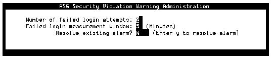 If the number of failed login attempts exceeds the number set in the Number of failed login attempts: field, an ASG warning alarm is created. Look for ASG alarms and resolve them using the Resolve existing alarm? field. |