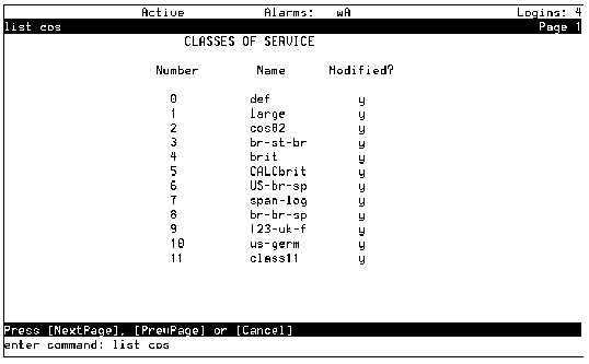 Classes of Service Screen; Viewing all COSs Table: Field Definitions: Classes of Service Screen Field Name Valid Input Description/Procedure Number Display only This field shows the number for this Class of Service. Name Display only This field shows name for this Class of Service. Modified? Display only This field shows an n until such time as you modify any fields on the screen. Once you save any changes, this field changes to a y.