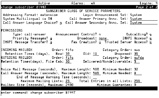 Table: Field Definitions: Subscriber Class of Service Parameters Screen Field Name Valid Input Description/ProcedureAddressing Format: Indicates the default way a subscriber with this COS is to address AUDIX messages. The subscriber can use the telephone interface to change this format from the default.Login Announcement Set: A unique name consisting of from 1 to 14 characters Indicates the announcement set that this subscriber hears when she or he logs in. If the multilingual feature is turned off, this field must either be blank or contain the word System.