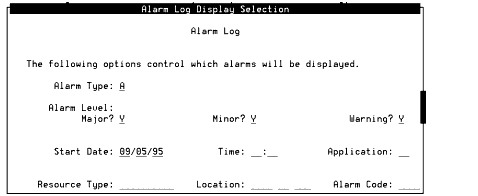 Display Selection Option Alarm Log FieldsAlarm Type Enter A to view active alarms or R to view resolved alarmsMajor Enter Y to view major alarms or N to ignore them.Minor Enter Y to view minor alarms or N to ignore them.Warning Enter Y to view warning alarms or N to ignore them.Start Date & Time Enter the date and time at which you want the display to begin.Application Enter the application code for which you want the alarms displayed.Resource Type Enter the resource type for which you want the alarms displayed.Location Enter the location for which you want the alarms displayed.Alarm Code Enter the alarm code for which you want the alarms displayed.