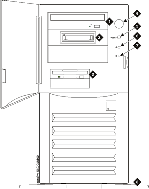 Figure: Front View (MAP/5PV4) CD-ROM drive Tape drive Diskette drive Power button Reset button Power LED Hard disk drive LED Stabilizing feet