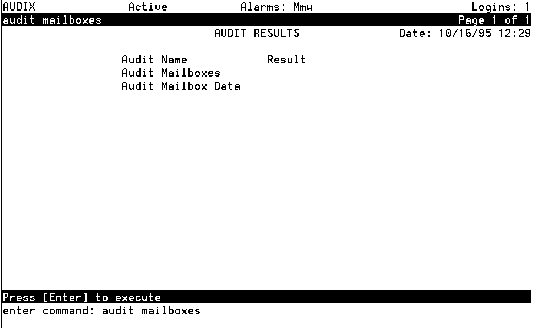 Table: Auditing Result Codes Code Meaning Code Meaning blank Audit has not been executed. F Last audit failed. R Audit is running. A Last audit aborted. P Last audit passed.