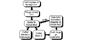 When DID or an Auto Attendant is used, users receive calls directly, without the intervention of an operator. In these situations, the telephone should have voice mail coverage instead of coverage by a receptionist (operator). The caller then has the option to leave a message or press 0 in order to talk to the receptionist. If after talking to the receptionist, the caller wants to leave a message, the receptionist can transfer the call back to voice mail using the Direct Voice Mail (DVM) feature.
