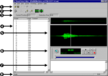 The currently selected prompt is graphically represented as a waveform in the Waveform View. You can edit audio data, using the Overview and Detailed sections of the Waveform View, the Waveform Toolbar, the Waveform Info fields and the Voice Player.