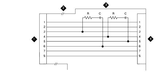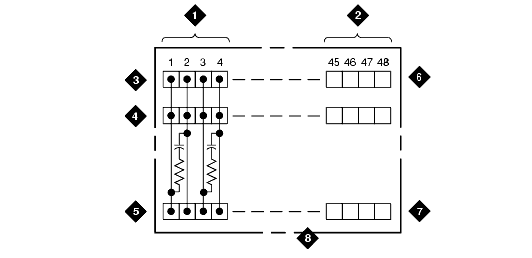 Terminating Resistor Block (110RA1-12) shows the wiring of the 110RA1-12. Three rows of 110D-4 connector blocks are mounted on a printed wire board along with circuit resistors and capacitors. The bottom row is designated as the input row and the top and middle rows are designated as the output rows. The circuit assembly is mounted on a standard 110A-100 pair mounting base. The 110RA1-12 is shipped with preprinted designation strips to simplify circuit identification and installation.
