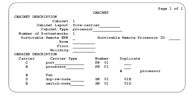 - Fill in the blanks as required by the location and nature of the cabinet. If the system is critical reliability, verify the B field is set to the processor option, the D field is set to the dup-sw-node option, and the E field is set to the switch-node option.