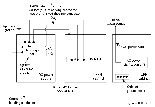 Typical Power and Ground for a Mixed AC/DC-Powered Cabinet shows a power and ground layout for a mixed AC/DC-powered cabinet configuration in the same equipment room with the PPN being DC powered and the EPN being AC powered. If a second EPN is part of the system, use the same basic connections.
