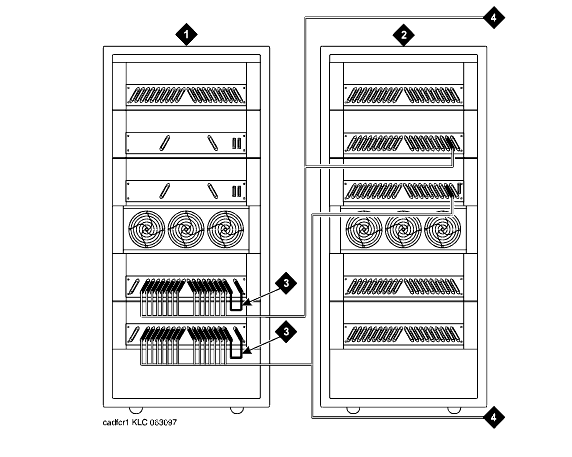 Critical-Reliability CSS-Connected with 1 Switch Node shows typical fiber optic cabling between cabinets. The cable between port slots 1 and 2 on each switch node is a metallic cable (H600-278).