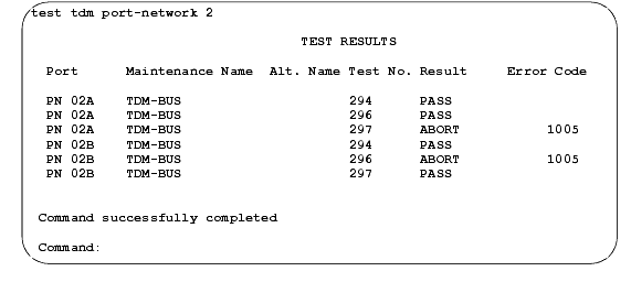 - If result is FAIL for any test, check the connectors of the TDM bus cables in Processor Port Network (PPN) 2.