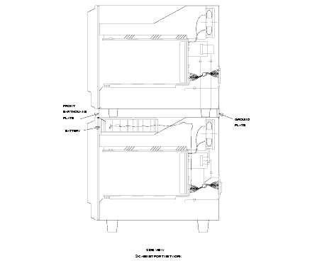 - At the front of the cabinet, line up the earthquake front plate with the holes at the top and bottom of the cabinet. See Locations of ground plate, earthquake front plate, and battery. Install the 8 screws but do not tighten them.