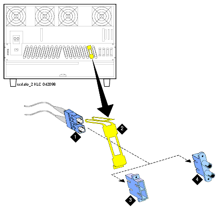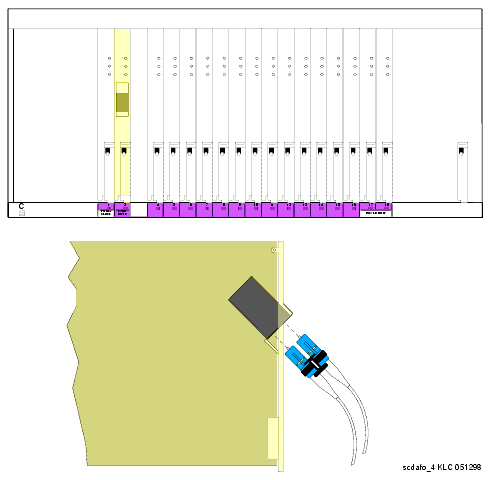 | Note: | For a duplicated system, use the pass-thru tool to bring 1 end of the cable to the front of each cabinet containing the duplication interface circuit packs. Connect the fiber cable to the duplication interface circuit pack in each carrier. Do not remove the I/O connector adaptor (referred to in steps 9 through 12 of this procedure). See Install fiber optic cable for duplicated SCC1 systems for illustrations of this process. |