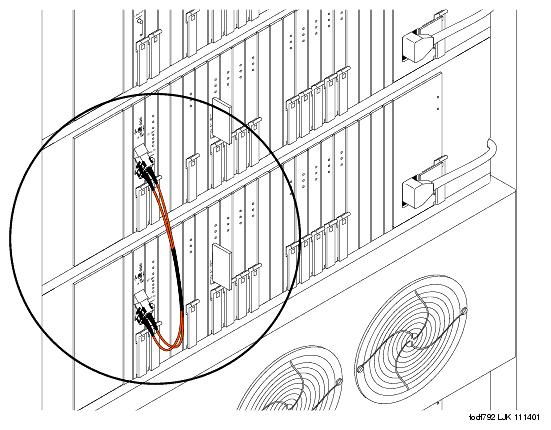 - If the carrier is located in a Multicarrier Cabinet (MCC1), attach the 14-in. fiber optic cable to the faceplates of the installed TN792 Duplication Interface circuit packs (see Fiber optic cable connecting the two TN792 duplication interface circuit packs (multicarrier cabinet only)).