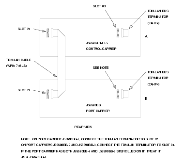 - On the top port cabinet, remove the existing terminator (AHF1), and replace it with a AHF110 TDM/LAN bus terminator.