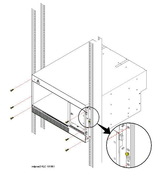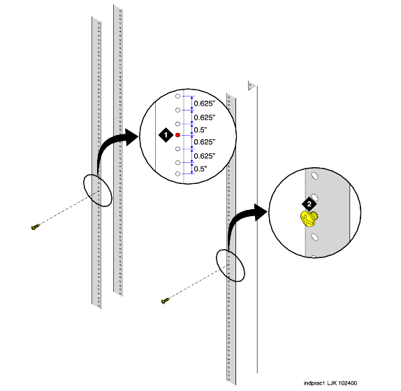 NOTE: The mounting screw holes in some commercial racks are not evenly spaced. Make sure the holes selected for mounting the media gateway are such that the rack holes match all the mounting bracket slots on the Guide. See Rack hole spacing and first mounting screws placement.