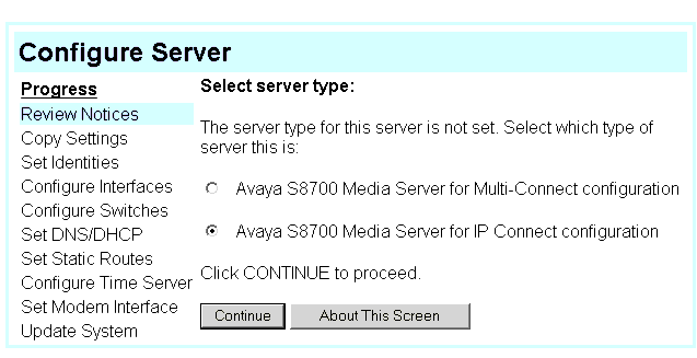 When a server is first initialized and configured it is necessary to set the configuration type (IP Connect or Multi-Connect). Refer to the filled out Pre-Installation Network Planning Forms--S8700 Media Server for the proper configuration type information.