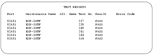 - Verify the screen displays test results similar to Sample Test Results for Expansion Interface Board 2A01--S8700 Multi-Connect. This example is for board 2a01.