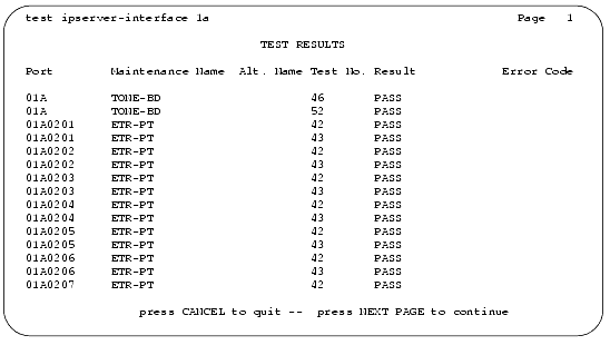 - Verify the screen displays Test Results screen similar to Sample IPSI 01A Test Results Screen -- Page 1, S8700 Multi-Connect.