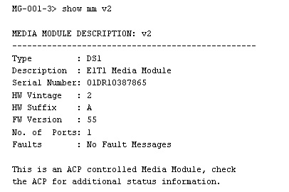This command shows the MG Media Module info. It displays the type(s) and