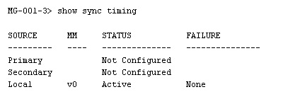 Privilege: All Description: show sync timing Displays the status of the primary, secondary, and the local clock sources. Status can be 'Active', 'Standby', or 'Not Configured' in the case where such a source has not been defined. For example, when there are no T1 cards installed. Parameters: None
