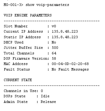Privilege: All Description: show voip-parameters [<mmid>] Displays the specified VoIP Engine's MAC address, static/DHCP IP addresses, RTP port, and whether the VoIP Engine setup is controlled via DHCP. Parameters: <mmID> is the Media Module ID. Absence of a specification implies the motherboard VoIP engine.