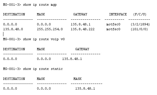 Privilege: All Description: [show ip route mgp {static | voip <mmID>}] Display the IP routing table contents. Parameters: <mmID> is the Media Module identification.