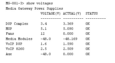 Privilege: All Description: show voltages Displays the status of power supply voltages by indicating whether or not the output is within the predefined limits. Parameters: None