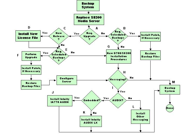 At the conclusion of the procedure for replacing the S8300 Media Server, the S8300 must be reconfigured for service. Figure 4 shows several tasks for the G700/S8300 system solution, depending on operational and configuration factors. The letters in the following list correspond to the letters in Figure 4: