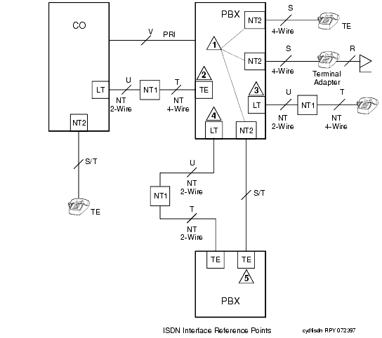 Figure 15 shows, for a generic integrated trunk-side BRI, the ISDN Interface Reference Points. Table 144 gives definitions for the generic ISDN Interface Reference Points.