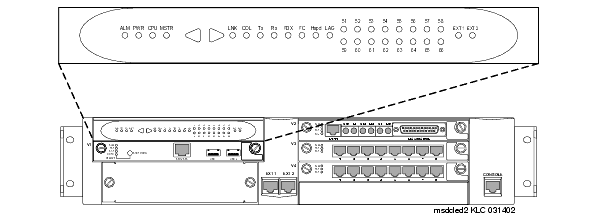 As shown in Figure 17, the LED panel is located on the top left corner of the G700. Directly below the LED panel is Media Module slot V1, which can be occupied by any type of Media Module. However, the S8300 Media Server can reside only in this particular slot because of height restrictions (for a specific discussion of the S8300 LEDs, please see S8300 Media Server LEDs.